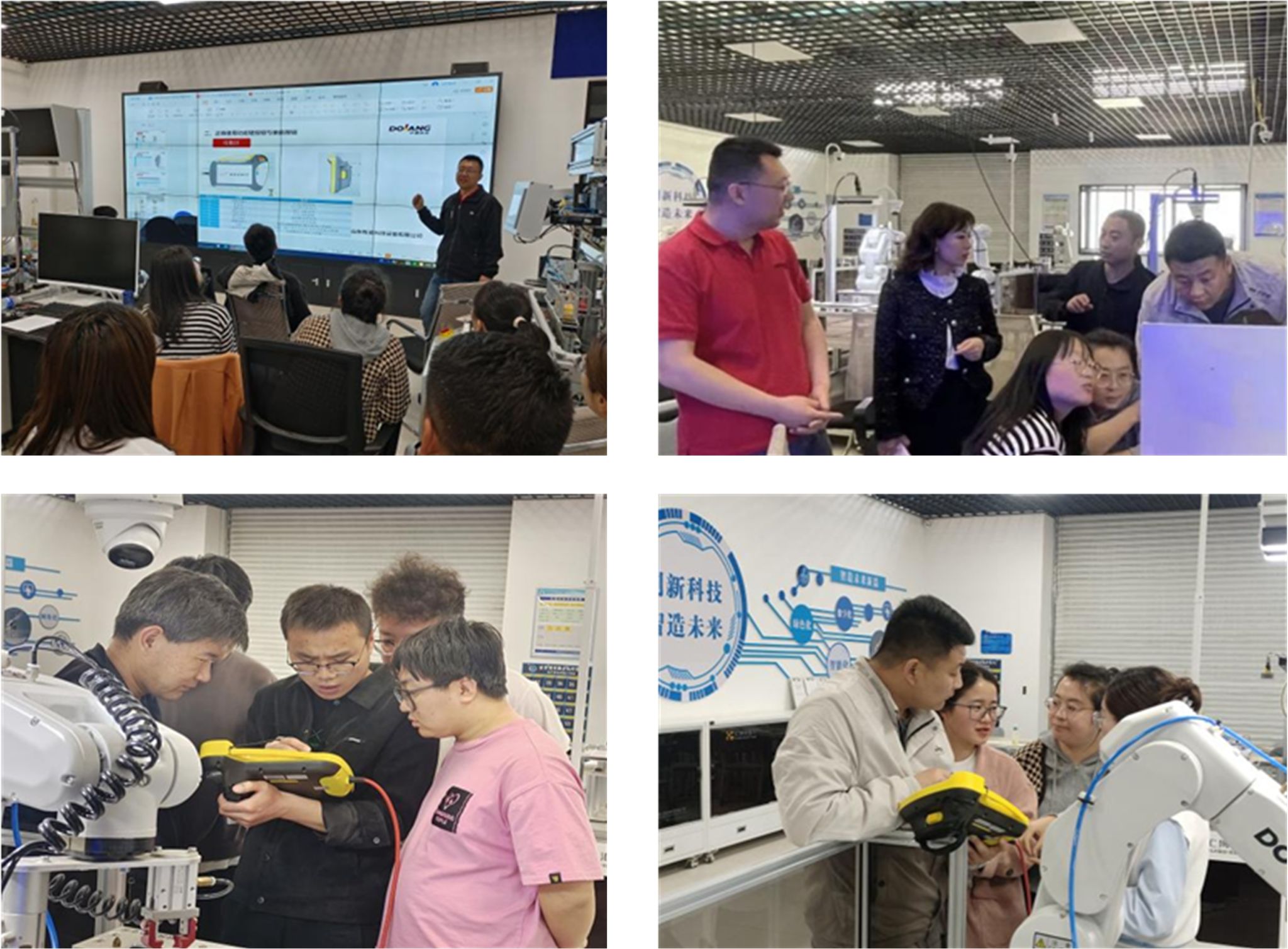 企业工程师系统讲解工业机器人基础理论,并现场演示机器人编程、调试与维护流程。参训教师通过实操练习,掌握了机器人坐标系设定、轨迹规划等核心技能,还就工业机器人在智能制造领域的应用案例展开研讨。