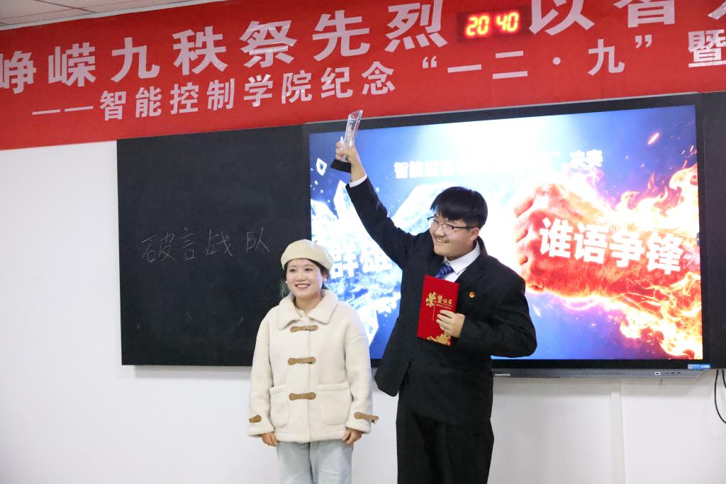 最终,经评委团综合评议,现场评选出冠亚军队伍及最佳辩手等奖项,领导嘉宾为获奖队伍及个人颁发荣誉证书,活动在热烈的氛围中圆满落幕。此次活动以纪念“一二·九”运动为契机,将爱国教育与思辨能力培养有机结合,不仅丰富了校园文化生活,更激励智能控制学院学子传承红色基因、锤炼过硬本领,以昂扬姿态投身强国建设、民族复兴的伟大征程。